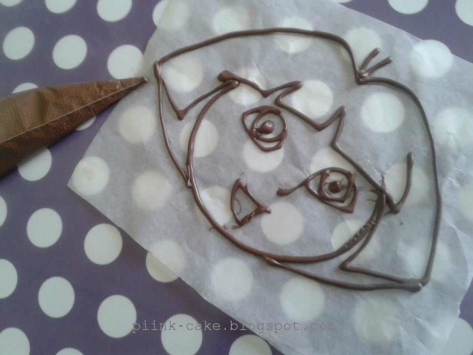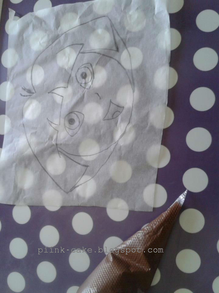 وقطعت شوكولاته قطع صغيره بطبق وسيحتها بالمايكرويف وحطيتها بقمع التزيين عشان استعملها لرسم تحديد وجه دورا